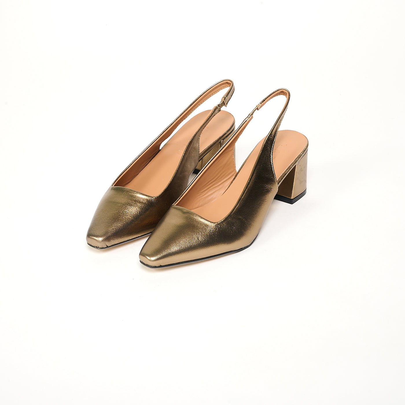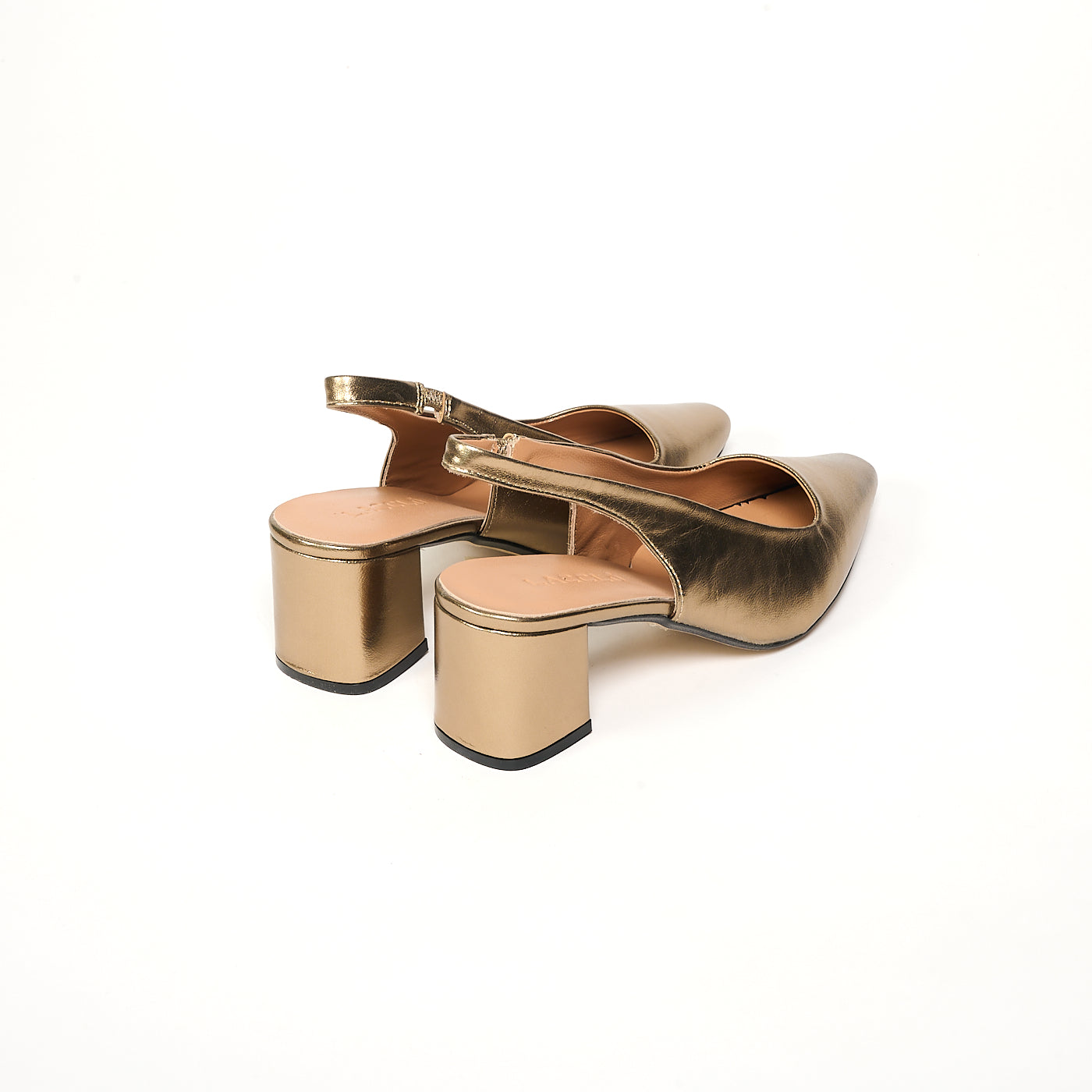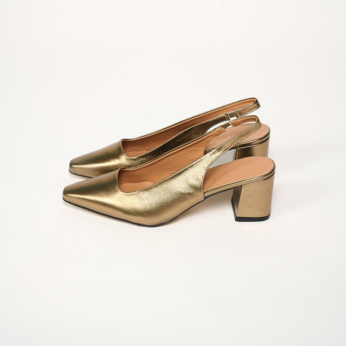 Destalonada en cuero metalizado color dorado envejecido, taco ancho forrado, 6 cms, suela antideslizante.